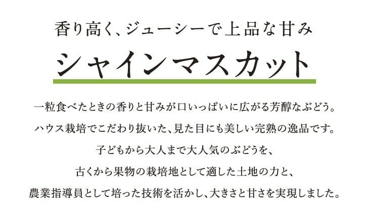 マスカットの芳醇な香りと濃厚な甘み、皮がプリッと弾ける食感に誰もが笑顔になります。